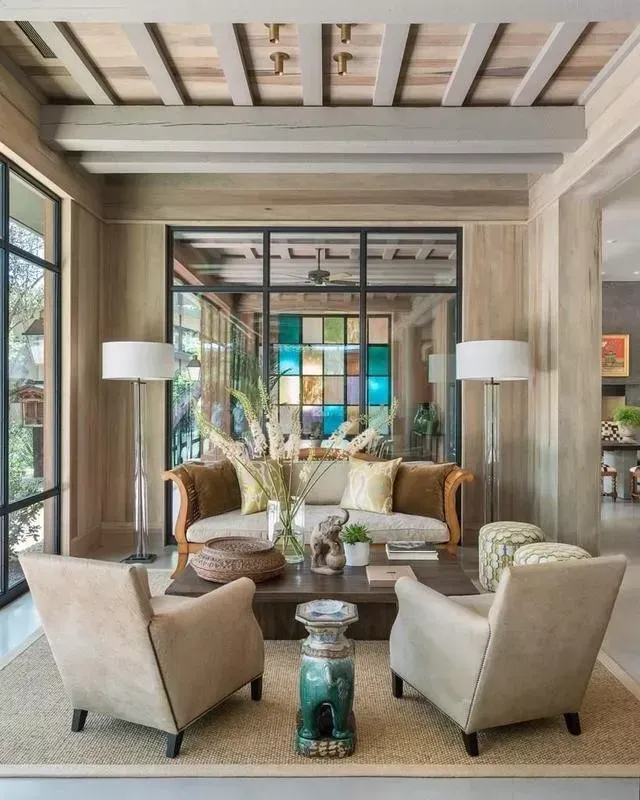 - Exposed wood beams running across vaulted ceilings