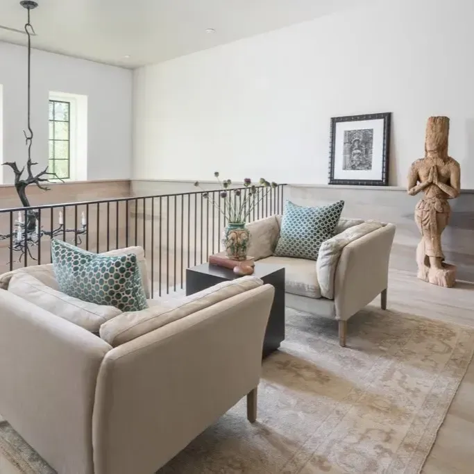 - Creamy neutral sofas with plush area rugs for comfort